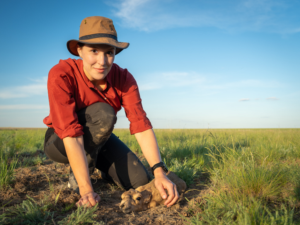 Wildtierärztin Hannah Emde neben einem kleinen Saiga-Kälbchen in der Steppe (aus "Terra X: Faszination Erde: Kasachstan - Die Steppe lebt").