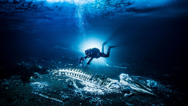 Das Licht unter einer geschlossenen Eisdecke oder an einem eingefrorenen Eisberg… - einzigartig, unbeschreiblich, unirdisch schön! Wir Menschen halten das mit einem Trockentauchanzug und dickem Unterzieher ungefähr eine Stunde aus und denken häufig, dass es kaum Leben in der Kälte gibt. Weit gefehlt! Bei einer Wassertemperatur von minus 2 Grad schweben hier zerbrechliche Quallen und durchsichtige Garnelen durch das Wasser, fressen knallige Schnecken auf den Algen. Und weil das noch nicht genug ist, schwimmt hier im tiefen Wasser noch einer der größten Haie der Welt seine Runden! Der Grönlandhai wirkt wie aus einer anderen Zeit und ist mit einem Alter von vermutlich über 500 Jahren das älteste Wirbeltier der Erde.