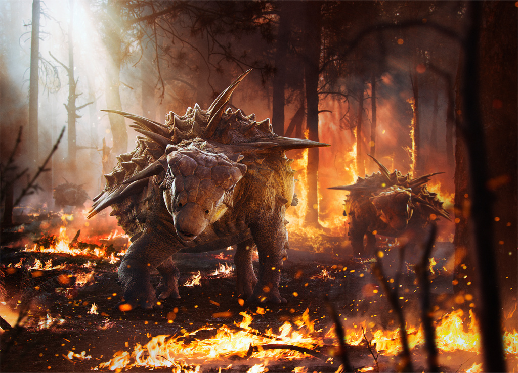 In der Wüste Utahs stößt ein Paläontologenteam unter der Leitung von Jim Kirkland und Josh Lively auf ein außergewöhnliches Fossilienfeld: die Überreste mehrerer junger Gastonia – mittelgroße Dinosaurier, deren Körper mit einem Panzer aus Knochenplatten und Stacheln bedeckt war. Die besonders gut erhaltenen Fossilien eines juvenilen Männchens fallen den Forschenden ins Auge: Sie taufen ihn George. Vor 130 Millionen Jahren war seine Heimat eine Welt aus Farnen, Flussläufen und Koniferenwäldern – und Lebensraum einiger der furchterregendsten Raubtiere ihrer Zeit: der Utahraptoren. So groß wie Grizzlybären waren diese massigen Cousins des Velociraptors schnell, intelligent und tödlich. Als Heranwachsender schließt George sich mit anderen jugendlichen Gastonia-Männchen zusammen, um den Raptoren etwas entgegensetzen zu können. Doch die Räuber treiben die Gruppe in einen tödlichen Hinterhalt. Alte Pollenproben mit Holzkohlespuren belegen: In dieser Landschaft wüteten immer wieder verheerende Waldbrände. Als der Wald erneut in Flammen aufgeht, kommt es zum alles entscheidenden Showdown. Inmitten von Rauch, Hitze und Chaos wird George an den Rand eines Sumpfes gedrängt.