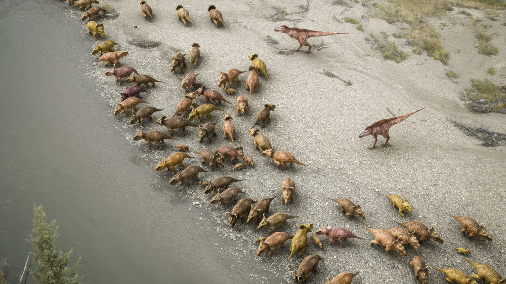 Tief im Norden Kanadas stößt ein Forschungsteam unter der Leitung von Emily Bamforth auf eine der spektakulärsten paläontologischen Entdeckungen der vergangenen Jahrzehnte: die Überreste einer gewaltigen Herde von Pachyrhinosauriern, einem massigen, pflanzenfressenden Dinosaurier mit knöcherner Stirnplatte, verwandt mit dem berühmten Triceratops. Unter den Fossilien sind auch die Überreste eines Jungtieres, das die Forschenden Albie taufen. Der Kleine war vor 72 Millionen Jahren Teil einer Herde, die mehr als 600 Kilometer zu neuen Weidegründen wanderte – durch Flüsse, Sümpfe, Wälder und tückisches Gelände. Inmitten von stampfenden Füßen, aufgewirbeltem Staub und rivalisierenden Bullen verliert Albie den Anschluss – und seine Mutter. Aber Pachyrhinosaurier hatten eine besondere Eigenschaft: Ihr hornartiger, individuell geformter Kragen machte jedes Tier einzigartig, vergleichbar mit einem biologischen Fingerabdruck. Die Forschenden glauben, dass diese Kragen ihnen halfen, einander selbst in der größten Herde wiederzuerkennen. Und tatsächlich – Albie findet seine Mutter wieder. Doch im Schatten lauern Gorgosaurier, Verwandte des T. rex. Und während sich die Herde weiter in Richtung Norden bewegt, zieht am Horizont eine noch größere Gefahr auf: ein gewaltiger Sturm, der die offene Landschaft in ein tödliches Labyrinth aus Wasser, Wind und Schlamm verwandelt.