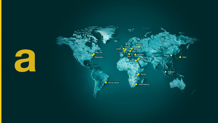 Moderationspult, Holzfußboden, Acrylglaselemente und ein Raum-umspannender Weltkugel-Print verleihen dem Studio Struktur und Tiefe. Die Bildsprache ist modern, ohne auf Bekanntes zu verzichten. Was die 50 Jahre alte TV-Marke prägt: die Weltkugel – und auch das "a". Das Key-Visual ist auch online das Wiederkennungsmerkmal – ob in der ZDFmediathek, auf heute.de oder in den Social-Media-Kanälen wie dem Twitter-Kanal "ZDFauslandsreporter" (@ReporterZDF).