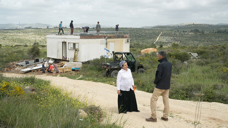 ZDF-Korrespondent Michael Bewerunge im Gespräch mit Siedler-Aktivistin Daniela Weiss vor einer illegalen Siedlung bei Nablus.
