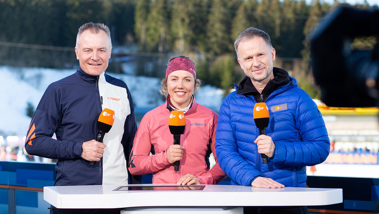 Biathlon-Experte Sven Fischer und Biathlon-Expertin Laura Dahlmeier mit ZDF-Moderator Alexander Ruda