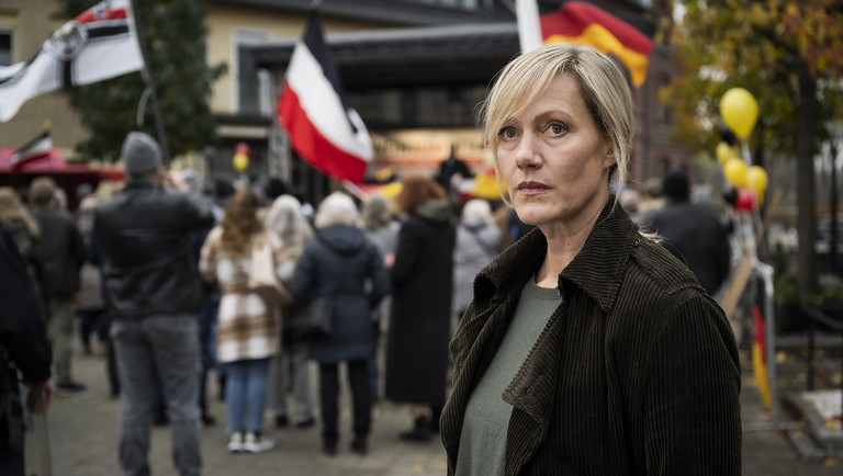 Filmfest Hamburg: „Die Bürgermeisterin“: Claudia Voss (Anna Schudt) realisiert, dass sie nichts gegen die rechte Demonstration in ihrer Stadt ausrichten kann.