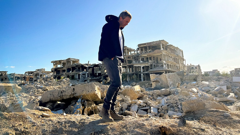 Nach zwölf Jahren Bürgerkrieg in Syrien: Markus Lanz in einem komplett zerstörten Stadtviertel von Damaskus. Copyright: ZDF/Anabel Münstermann
