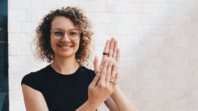 Reporterin Iris moderiert in Deutscher Gebärdensprache.