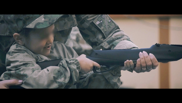 Ein uniformiertes Mädchen bei der Schießausbildung der paramilitärischen Truppe "Junarmija" / Foto: ZDF/Ksenia Bolchakova