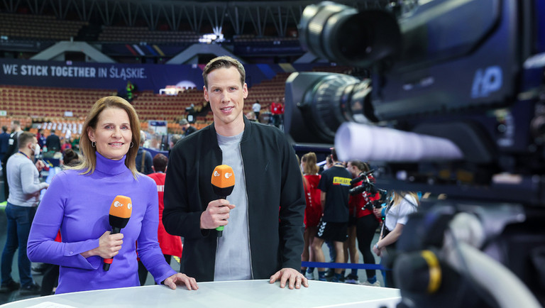ZDF-Moderatorin Katrin Müller-Hohenstein und ZDF-Handball-Experte Sören Christophersen führen durch die Live-Übertragung des WM-Viertelfinales Frankreich - Deutschland. Copyright: ZDF/picture alliance/Jan Woitas