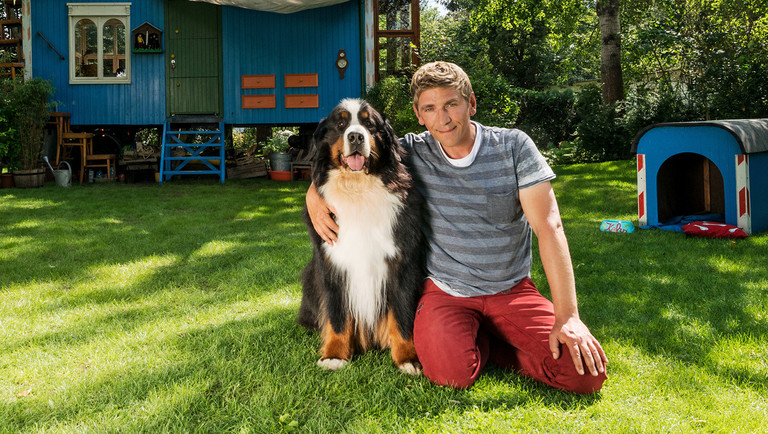 Fritz Fuchs (Guido Hammesfahr) mit seinem Hund Keks vor dem Bauwagen