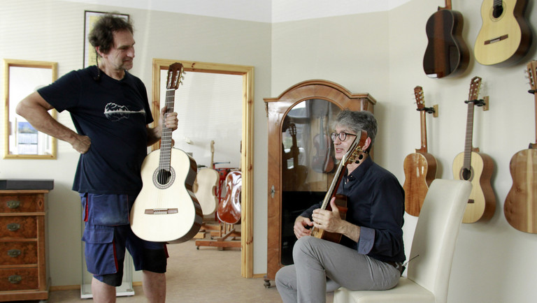 Gitarrenbauer Armin Hanika (l.) testet mit Gitarrist und Komponist Stefan Grasse (r.) seine "nachhaltige" Gitarre aus thermo-modifizierten, heimischen Hölzern. Copyright: ZDF/Cordula Stadter