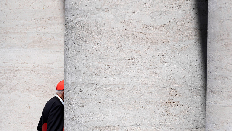 Nach dem Kardinalskollegium auf dem Weg durch die Kolonnaden des Petersplatzes im Vatikan.