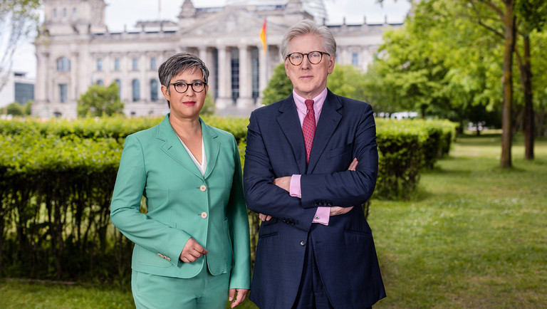 Shakuntala Banerjee und Theo Koll starten in ihre fünfte "Sommerinterview"-Staffel. / Copyright: ZDF/Jens Gyarmaty