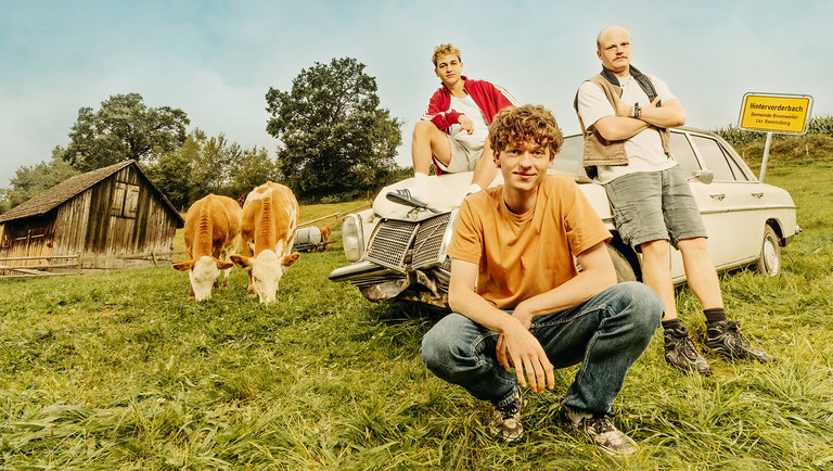 Szenenfoto aus "Tschappel": Carlo (Jeremias Meyer, Mitte) und seine Kumpels Aydin (David Ali Rashed) und BlaBla (Sebastian Jakob Doppelbauer, v.li.)
