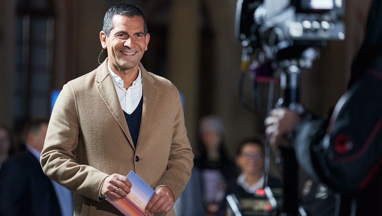 Im Pfalzbau begrüßt "Moma vor Ort"-Moderator Mitri Sirin Bürgerinnen und Bürger sowie Gesprächsgäste aus Politik, Wirtschaft und Stadtleben, unter anderem die rheinland-pfälzische Ministerpräsidentin Malu Dreyer sowie Ludwighafens Oberbürgermeisterin Jutta Steinruck.