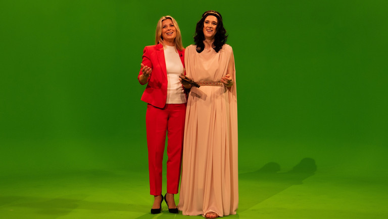 Valerie Niehaus (l.) mit Kaiser-Nero-Reporterin Katjana Gerz (r.), die gerade aus dem Jahr 67 von ihrem Interview mit Kaiser Nero anlässlich der Olympischen Spiele und dessen Erfolge zurückgekehrt ist. © ZDF und Benjamin Zeitz