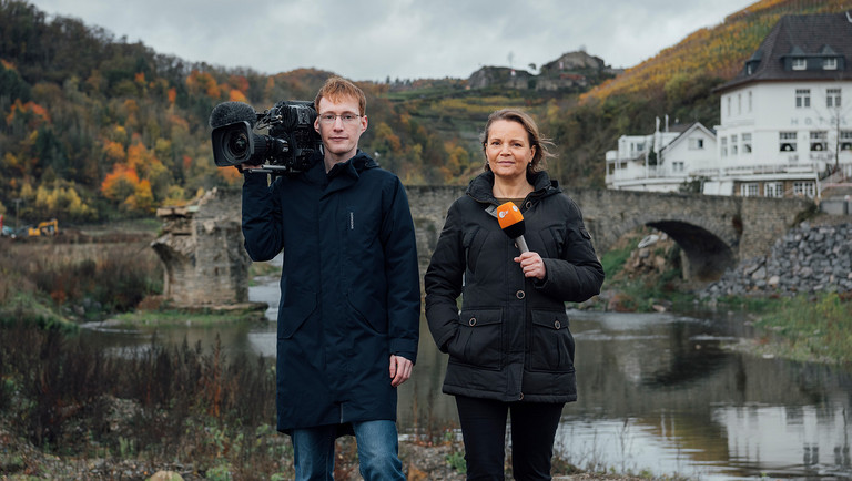 Kameramann Christoph Timm und Reporterin Marion Geiger an der zerstörten historischen Brücke in Rech im Ahrtal. Copyright: ZDF/Jann Höfer