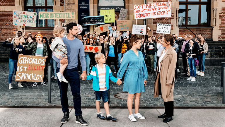 Du sollst hören: Simon Ebert (Benjamin Piwko, 2.v.l.) steht zusammen mit seiner Familie Conny Ebert (Anne Zander, 2.v.r.), Mila Ebert (Delia Pfeffer, l.) und Mats Ebert (Leif-Eric Werk, M.) neben Jolanda Helbig (Claudia Michelsen, r.) vor dem Amtsgericht in Köln. Die Richterin wird über die Zukunft von Mila entscheiden. / Copyright: ZDF/[F] Silviu Guiman / [M] Andrea Preysing
