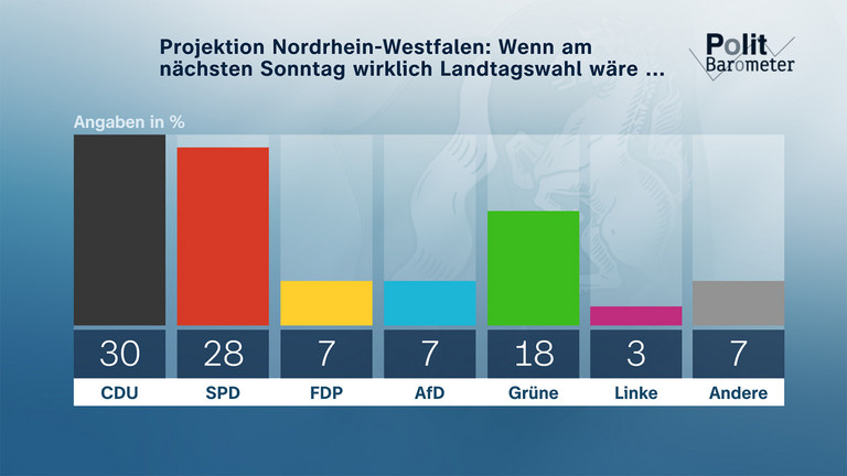 Wenn schon am nächsten Sonntag gewählt würde, ergäben sich die folgenden Projektionswerte für die Parteien: Die CDU käme zurzeit auf 30 Prozent, die SPD auf 28 Prozent, die FDP auf 7 Prozent, die AfD auf 7 Prozent, die Grünen auf 18 Prozent und die Linke auf 3 Prozent. Die anderen Parteien lägen zusammen bei 7 Prozent, darunter keine Partei, die mindestens 3 Prozent erreichen würde. Damit gäbe es eine Mehrheit für eine Koalition aus CDU und Grünen, knapp reichen würde es auch für eine rot-grüne Regierung.