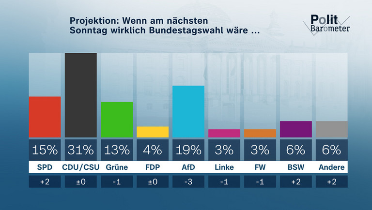 Die im Moment politisch bewegten Zeiten spiegeln sich auch in der Politbarometer-Projektion wider. Wenn am nächsten Sonntag wirklich Bundestagswahl wäre, könnte sich die SPD auf 15 Prozent (plus 2) verbessern, und die CDU/CSU käme unverändert auf 31 Prozent. Die Grünen würden nur noch 13 Prozent (minus 1) erreichen, das ist ihr schlechtester Wert seit knapp sechs Jahren. Die FDP bliebe bei 4 Prozent (unverändert). Deutliche Verluste gäbe es für die AfD mit 19 Prozent (minus 3) und auch die Linke mit 3 Prozent (minus 1) sowie die Freien Wähler mit 3 Prozent (minus 1) hätten Einbußen. Dagegen könnte das "Bündnis Sahra Wagenknecht" mit 6 Prozent (plus 2) klar zulegen. Die anderen Parteien lägen zusammen bei 6 Prozent (plus 2), darunter keine Partei, die mindestens drei Prozent erzielen würde. Bei einem solchen Ergebnis hätte die Ampelkoalition weiterhin keine parlamentarische Mehrheit. Von den politisch realistischen Bündnissen würde es reichen für eine Koalition aus CDU/CSU und SPD sowie für eine Koalition aus CDU/CSU und Grünen.
