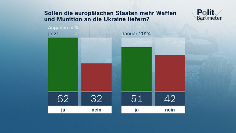 Zwei Jahre nach dem Überfall Russlands auf die Ukraine steht eine deutliche Mehrheit der Deutschen hinter der militärischen Unterstützung der Ukraine. Nach 51 Prozent im Januar sprechen sich jetzt 62 Prozent dafür aus, dass die europäischen Staaten dem Land mehr Waffen und Munition liefern sollen. 32 Prozent sind dagegen (Jan: 42 Prozent ‒ Rest zu 100 Prozent hier und im Folgenden jeweils "weiß nicht"). Diese Einschätzung geht quer durch fast alle Parteianhängergruppen, lediglich unter den AfD-Anhängern (81 Prozent) lehnt eine klare und unter den BSW-Anhängern (57 Prozent) eine knappe Mehrheit mehr Waffen und Munition für die Ukraine ab.