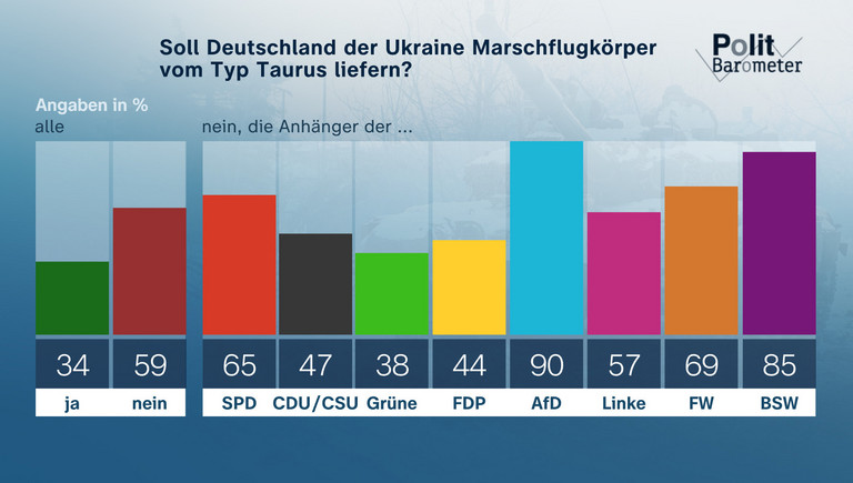 Bei der gerade heftig diskutierten Frage, ob Deutschland der Ukraine Marschflugkörper vom Typ Taurus liefern soll, zeigen sich die meisten Befragten zurückhaltend. 59 Prozent lehnen das ab, nur 34 Prozent sind dafür (Rest zu 100 Prozent hier und im Folgenden jeweils "weiß nicht"). Dabei spricht sich rund die Hälfte in den Anhängerschaften von Grünen (54 Prozent) und FDP (49 Prozent) für die Lieferung von Taurus-Marschflugkörpern aus, mit denen auch weiter entfernte Ziele in Russland getroffen werden könnten. Bei den Anhängern von SPD (65 Prozent), Linke (57 Prozent), Freie Wähler (69 Prozent), BSW (85 Prozent) und AfD (90 Prozent) überwiegt dagegen die Ablehnung. Die Unions-Anhänger sind in dieser Frage gespalten (dafür: 45 Prozent; dagegen: 47 Prozent).