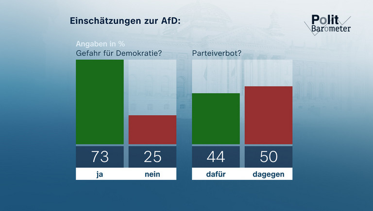 Für fast drei Viertel der Befragten (73 Prozent) geht von der AfD eine Gefahr für die Demokratie aus, 25 Prozent sehen das nicht so (Rest zu 100 Prozent hier und im Folgenden jeweils "weiß nicht"). Dabei schließen sich im Westen 76 Prozent dieser Einschätzung an, im Osten 63 Prozent. Ein Verbot der AfD unterstützen lediglich 44 Prozent, darunter Mehrheiten in den Anhängerschaften von SPD (59 Prozent) und Grünen (65 Prozent). Insgesamt 50 Prozent sind gegen ein Verbot der AfD.