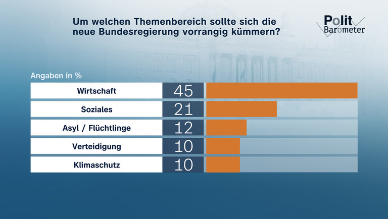 Seit Längerem meint eine Mehrheit der Befragten, dass es mit der deutschen Wirtschaft eher abwärts geht, kaum jemand erwartet eine Erholung. Verschärft wird die Lage noch durch die Zollpolitik von US-Präsident Donald Trump. Vor diesem Hintergrund verwundert es nicht, dass die meisten der Meinung sind, dass sich die neue Bundesregierung vorrangig um die Wirtschaft kümmern müsse. Von den fünf zum Ranking vorgelegten Themenbereichen nennen mit 45 Prozent die meisten "Wirtschaft" vor "Soziales" mit 21 Prozent. Ähnlich viele halten "Asyl/Flüchtlinge" (12 Prozent), "Verteidigung" (10 Prozent) und "Klimaschutz" (10 Prozent) für die Aufgaben, um die sich die zukünftige Regierung vordringlich kümmern sollte (Rest zu 100 Prozent hier und im Folgenden jeweils "weiß nicht").