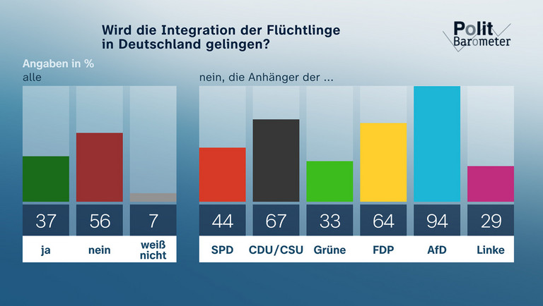 Unterbringung und Integration von Geflüchteten sind zurzeit für Kommunen und Länder eine große Herausforderung. Mit 56 Prozent sind die meisten Befragten der Meinung, dass es nicht gelingen wird, die Flüchtlinge bei uns einzugliedern. Nur 37 Prozent gehen davon aus, dass die Integration erfolgreich sein wird. Große Bedenken diesbezüglich äußern vor allem die Anhänger von AfD (94 Prozent), CDU/CSU (67 Prozent) und FDP (64 Prozent).