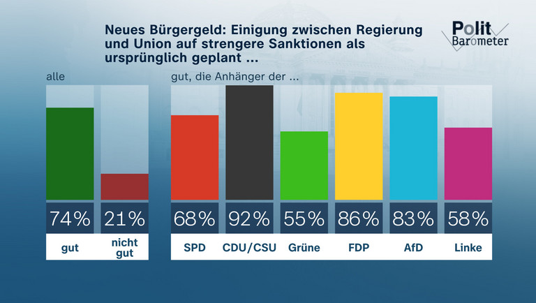 Nach heftigem Streit zwischen Regierung und CDU/CSU gab es beim Bürgergeld diese Woche einen Kompromiss, dem auch der Vermittlungsausschuss von Bundestag und Bundesrat zugestimmt hat. Die Einigung sieht strengere Vorgaben und Sanktionen für Arbeitslose vor, als das von der Ampelkoalition ursprünglich geplant war. Fast drei Viertel der Befragten (74 Prozent) finden es gut, dass es nun doch von Anfang an strengere Regelungen geben soll. Neben den weitaus meisten Anhängern von CDU/CSU (92 Prozent), FDP (86 Prozent) und AfD (83 Prozent) sehen das auch Mehrheiten in den Anhängerschaften von SPD (68 Prozent), Linke (58 Prozent) und Grünen (55 Prozent) so. Nur insgesamt 21 Prozent lehnen dieses strengere Vorgehen ab (Rest zu 100 Prozent hier und im Folgenden jeweils "weiß nicht"). Mit dem neuen Bürgergeld soll es ab Januar 2023 für Leistungsbezieher unter anderem eine Erhöhung des Regelsatzes um 53 Euro geben. 44 Prozent finden diese Anhebung gerade richtig, rund ein Viertel hält sie für zu hoch (23 Prozent) und ähnlich viele für zu niedrig (26 Prozent).