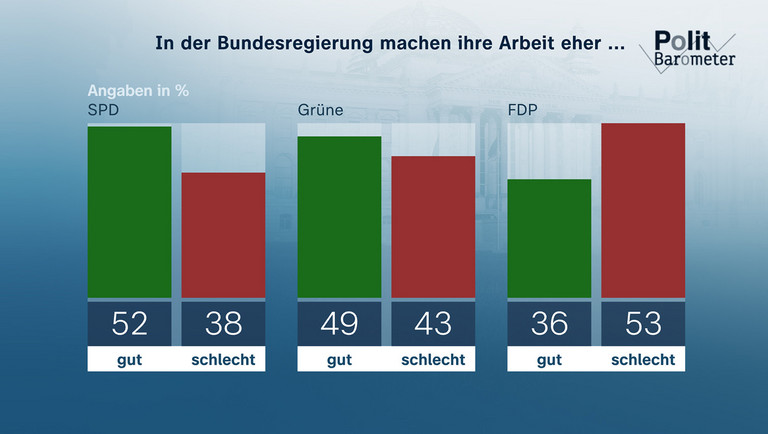 Insgesamt erhält die Bundesregierung aktuell eher bescheiden positive Zufriedenheitswerte. Die einzelnen Regierungspartner werden dabei ganz unterschiedlich beurteilt: Während die meisten mit der Arbeit der SPD (gut: 52 Prozent; schlecht: 38 Prozent) und der Grünen (gut: 49 Prozent; schlecht 43 Prozent) in der Regierung eher zufrieden sind, meint eine Mehrheit von 53 Prozent, dass die FDP in der Regierung eher eine schlechte Arbeit macht. Nur 36 Prozent eher eine gute.