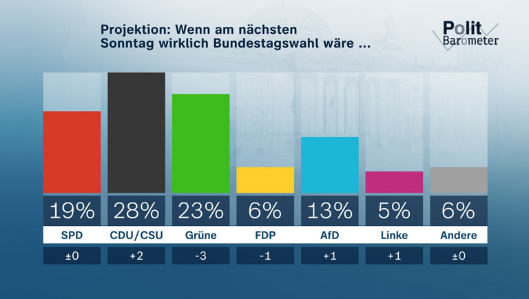 Die deutlich zurückgegangene Zufriedenheit mit der Arbeit der Bundesregierung macht sich auch bei der Projektion bemerkbar: Wenn am nächsten Sonntag wirklich Bundestagswahl wäre, käme die SPD auf 19 Prozent (unverändert) und die CDU/CSU auf 28 Prozent (plus 2). Die Grünen hätten deutliche Verluste und kämen nur noch auf 23 Prozent (minus 3), die FDP auf 6 Prozent (minus 1) und die AfD auf 13 Prozent (plus 1). Die Linke würde mit 5 Prozent (plus 1) wieder in den Bundestag kommen und die anderen Parteien lägen weiterhin bei 6 Prozent, darunter keine Partei, die mindestens drei Prozent erzielen würde.