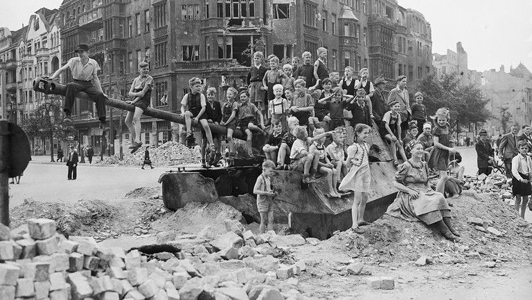 Kinder spielen im Jahr 1945 im durch Bomben zerstörten Berlin auf einem Panzer.