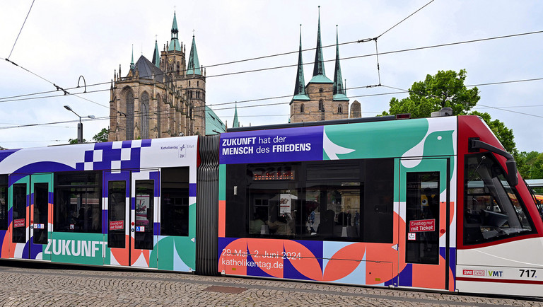 Vom 29. Mai bis zum 5. Juni 2024 findet in Erfurt der 103. Katholikentag statt. Mit einer eigens beklebten Straßenbahn wurde ein Jahr lang in der Stadt für das Großereignis geworben.