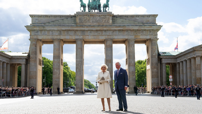 Der damalige Prinz Charles von Großbritannien und seine Ehefrau Camilla, damalige Herzogin von Cornwall, bei ihrem Deutschland-Besuch am 7. Mai 2019 vor dem Brandenburger Tor in Berlin. Noch vor seiner Krönung besucht König Charles III. Deutschland. Copyright: ZDF/dpa/Soeren Stache
