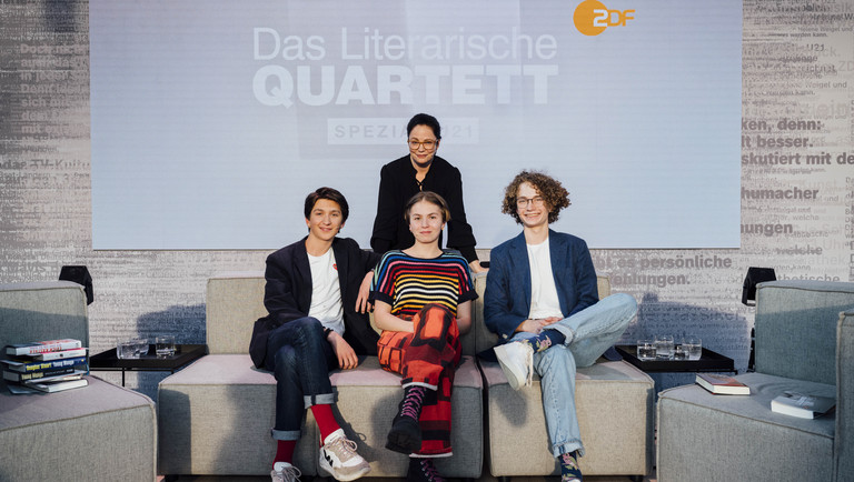 Zum letzten "Literarischen Quartett spezial - U21" am 28.04.2023 trafen sich mit Thea Dorn: Nick Adolff, Cara Platte und Julius Zimmermann.