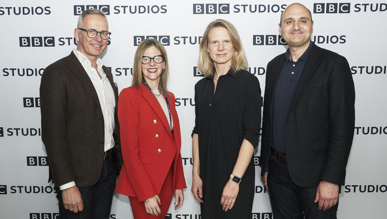 v.l.n.r.: Markus Schäfer (Geschäftsführung ZDF Studios GmbH), Rebecca Glashow (CEO, Global Distributions, BBC Studios) Nadine Bilke (ZDF-Programmdirektorn), Tom Fussell (CEO, BBC Studios). Copyright: BBC Studios