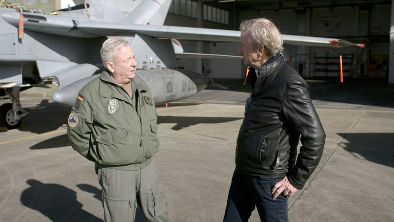 Oberst Thomas Schneider, Kommodore des "Taktischen Luftwaffengeschwaders 33" in Büchel, im Gespräch mit ZDF-Autor Claus Kleber.