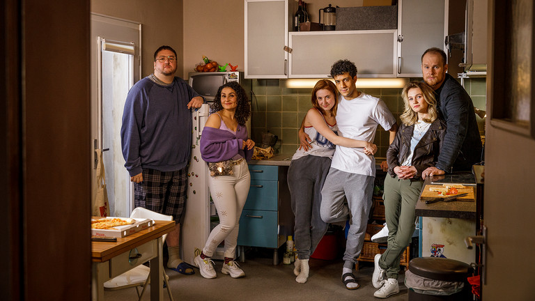 Von links: Tüffi (Daniel Zillmann), Jackie (Nagmeh Alaei), Caro (Meriel Hinsching), Yannik (Rojan Juan Barani), Svenja (Leonie Wesselow) und Sven (Sven Daniel Bühler)
