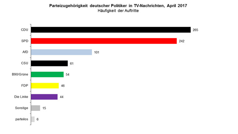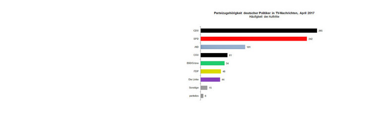 Die CDU behauptete mit 265 Politikerauftritten vor der SPD mit 242 Auftritten weiterhin die Spitzenposition unter den Parteien. Einen deutlichen Zuwachs an Auftritten hatte die AfD (101 Auftritte) anlässlich ihres umstrittenen Parteitags und der parteiinternen Flügelkämpfe zu verzeichnen. Mit Abstand folgten die CSU (61 Auftritte), die Grünen (54), die FDP (46) und Die Linke (44 Auftritte) sowie Sonstige (15), darunter Pro Deutschland und die von Bernd Lucke neu positionierte LKR (Liberal-Konservative Reformer) als Alternative zur AfD, ferner die Auftritte diverser parteiloser Politiker (6 Auftritte).