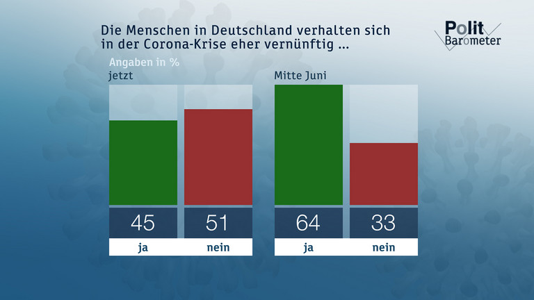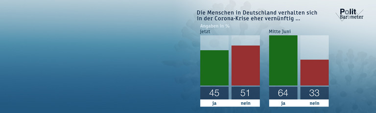 In Deutschland sind die Infektionszahlen zuletzt wieder angestiegen. Gut drei Viertel der Befragten (77 Prozent) befürchten, dass es in der nächsten Zeit bei uns zu einer zweiten Corona-Welle, also zu deutlich erhöhten Infektionszahlen mit dem Coronavirus, kommt. Nur 20 Prozent gehen nicht davon aus (Rest zu 100 Prozent hier und im Folgenden jeweils "weiß nicht"). Vor diesem Hintergrund überwiegt mit 51 Prozent (Juni I: 33 Prozent) erstmals die Einschätzung, dass die Menschen sich in der Corona-Krise eher unvernünftig verhalten. 45 Prozent (Juni I: 64 Prozent) gehen von einem eher vernünftigen Umgang mit der Krise aus, darunter mehrheitlich nur die Anhänger von AfD (70 Prozent) und FDP (52 Prozent).