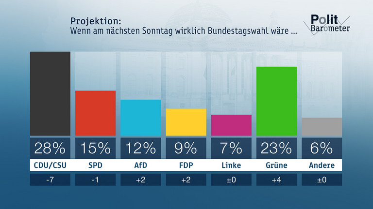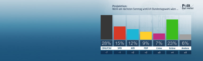 Nach den Landtagswahlen in Baden-Württemberg und Rheinland-Pfalz, der Maskenaffäre und dem Hin und Her beim Shutdown über Ostern verliert die Union in der Politbarometer-Projektion stark an Zustimmung. Wenn am nächsten Sonntag wirklich Bundestagswahl wäre, kämen CDU/CSU nur noch auf 28 Prozent, das ist ein Rekord-Rückgang um sieben Punkte auf ihr Vor-Corona-Niveau. Die SPD könnte mit 15 Prozent (minus 1) rechnen, die AfD mit 12 Prozent (plus 2) und die FDP mit 9 Prozent (plus 2), die Linke bliebe bei 7 Prozent. Deutlich verbessern könnten sich die Grünen mit 23 Prozent (plus 4), die anderen Parteien zusammen lägen unverändert bei 6 Prozent. Damit hätte eine Koalition aus CDU/CSU und Grünen eine Mehrheit, eine Koalition aus CDU/CSU und SPD aber nicht mehr. Knapp nicht reichen würde es für ein Bündnis aus Grünen, SPD und FDP, und Grün-Rot-Rot wäre ebenfalls nicht mehrheitsfähig.