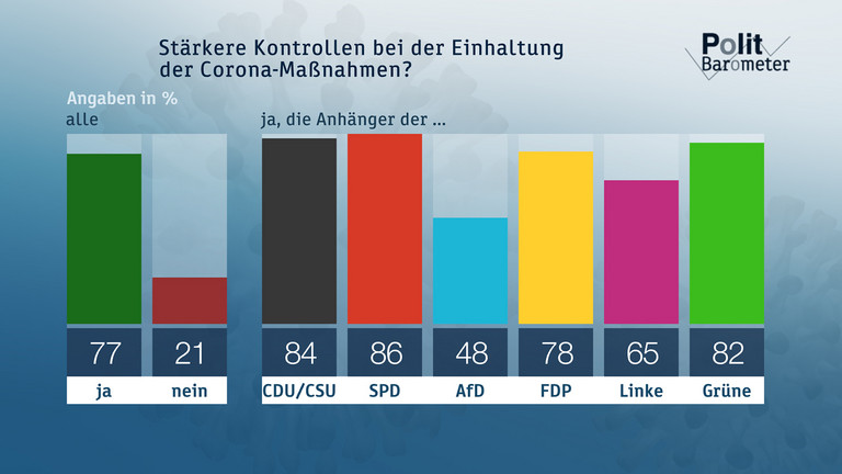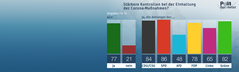 Gut drei Viertel der Befragten (77 Prozent) sprechen sich für eine stärkere Kontrolle bei der Einhaltung der Corona-Maßnahmen aus, darunter Mehrheiten in allen Parteianhänger-gruppen, mit Ausnahme der AfD-Anhänger (dafür: 48 Prozent).