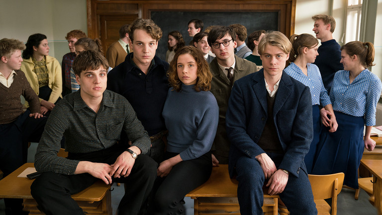 "Das schweigende Klassenzimmer": Eric (Jonas Dassler, l.), Theo (Leonard Scheicher, 2.v.l.), Lena (Lena Klenke), Paul (Isaiah Michalski, 2.v.r.) und Kurt (Tom Gramenz, r.) mit ihren Mitschülern.