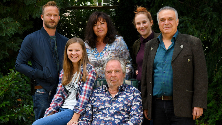 Polizist Franz Germinger Junior (Maximilian Brückner, hinten links) und seine Familie (hinten v.l.n.r. Gundi Ellert, Marlene Morreis, Jockel Tschiersch, vorne Stella Föringer und Friedrich von Thun)