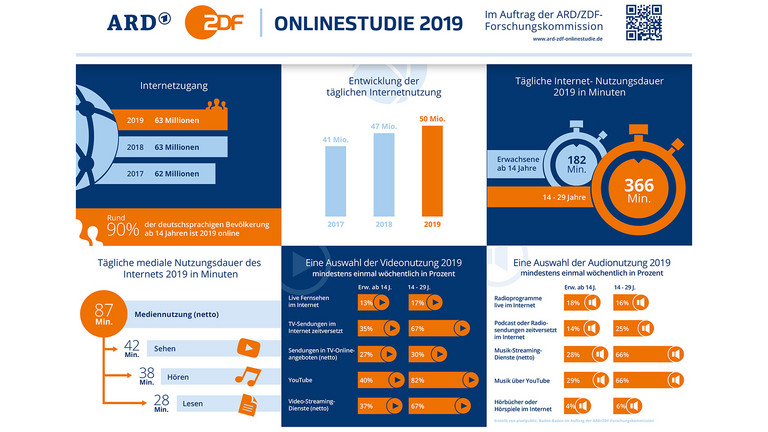 Die ARD/ZDF-Onlinestudie 2019 wurde im Rahmen der "Studienreihe Medien und ihr Publikum (MiP)" und im Auftrag der ARD/ZDF-Forschungskommission durchgeführt. Die Ergebnisse beruhen auf dem fusionierten Datensatz mit den Kerndaten der Massenkommunikation Trends 2019. Im Jahr 2019 wurden in einer repräsentativen Dual-Frame-Stichprobe insgesamt 2000 deutschsprachige Personen ab 14 Jahren befragt. Die Feldarbeit wurde erstmals vom Institut Kantar durchgeführt und dauerte von Ende Januar bis Mitte April 2019. Eine ausführliche Analyse der Daten ist in der neuesten Ausgabe der Fachzeitschrift "Media Perspektiven" (Heft 9/2019) dokumentiert. Außerdem werden mit dieser Pressemeldung eine Infografik und ein 16-seitiges PDF mit den wichtigsten Ergebnissen veröffentlicht, die wie die Fachartikel auf der Website http://www.ard-zdf-onlinestudie.de bereitgestellt werden.