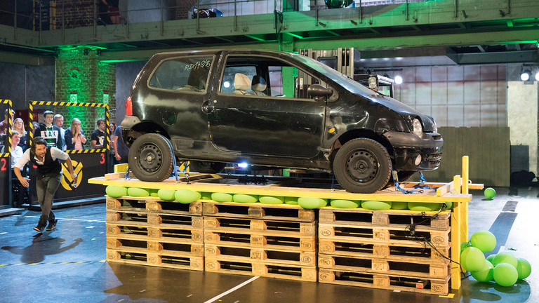 Können Luftballons ein Auto halten? Im großen CO2 Battle testet Moderator Tommy Scheel auch die unbekannteren und überraschenden Eigenschaften des Gases.