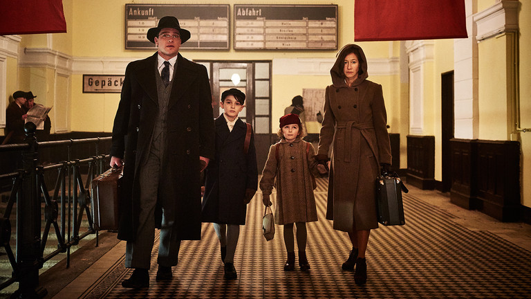 Richard (Ronald Zehrfeld, l.) und Claire Kornitzer (Johanna Wokalek, r.) sind entschlossen, ihre Kinder Georg (Moritz Hoyer, 2.v.l.) und Selma (Lisa Marie Trense, 2.v.r.) in Sicherheit zu bringen. Sie sollen mit einer Hilfsorganisation nach England.
