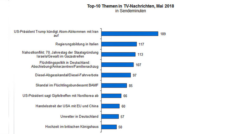 Auf den weiteren Rangplätzen 6 bis 10 folgten Berichte über US-Präsident Trumps Absage zu einem Gipfeltreffen mit Nordkorea (68 Min.), das später im zweiten Anlauf doch wieder auf der Agenda stand, ferner der Handelsstreit der USA mit der EU und China (60 Min.), Unwetter in Deutschland (57 Min.), Hochzeit im britischen Königshaus (50 Min.) und die EU-Datenschutzverordnung (DSGVO) (44 Min.).