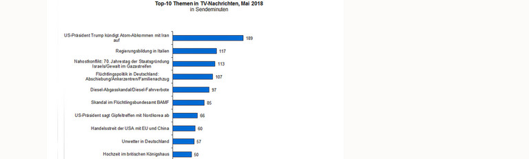 Die Aufkündigung des Atom-Abkommens mit Iran durch US-Präsident Donald Trump war das Topthema der deutschen Fernsehnachrichten im Mai. Wie das IFEM Institut für empirische Medienforschung (Köln) in seiner monatlichen Nachrichtenanalyse ermittelte, entfielen in Tagesschau 20 Uhr, Tagesthemen, heute 19 Uhr, heute journal, RTL aktuell und den Sat.1 Nachrichten insgesamt 189 Minuten (über 3 Stunden) Sendezeit auf diesen Themenkomplex. Die Berichterstattung befasste sich mit dem Akt der Kündigung des Atom-Abkommens und der Begründung des amerikanischen Präsidenten. Schwerpunkte waren ebenso die internationalen Reaktionen auf Trumps Entscheidung, so etwa vonseiten der Internationalen Atomenergie-Organisation (IAEO), die keinen Verstoß Irans bestätigen konnte. Berichtet wurde über Kritik der EU und Deutschlands an Trumps Entscheidung, von der die Beziehungen zum Iran und eigene Wirtschaftsinteressen betroffen waren.