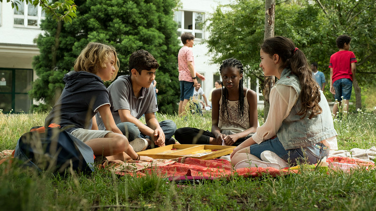 Die vier Freunde Moritz, Yassir, Aminata und Rüyet (Michael Sommerer, Julius Göze, Jodyna Basombo, Sura Demir) aus Dschermeni